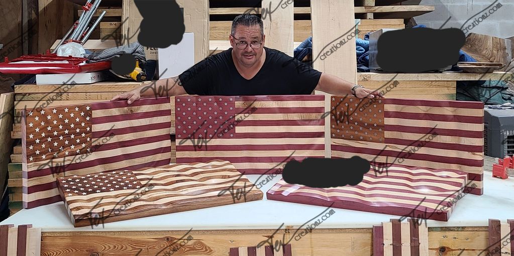 Purpleheart, Curly Maple, Walnut and Monkeypod. These flags are all made by me a retired Police Officer and are my most meaningful creations I proudly create. 1st Responders and Veterans get 50.00 off the retail price. These are free shipping in the US.